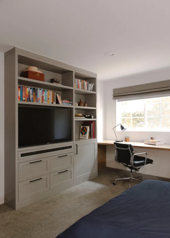 As a feng shui enthusiast, I don’t often recommend TVs in bedrooms. That said—I also know that we’re all human, and many of us love watching a show before bed. The key is balance. For this project, the solution was a custom built-in that integrates the TV seamlessly with shelving for books, clothing, and accessories. The design anchors the wall, keeps the room orderly, and avoids the visual chaos of freestanding furniture. Another variation could include doors to close off the TV when not in use—something I often recommend for bedrooms to restore a sense of calm.